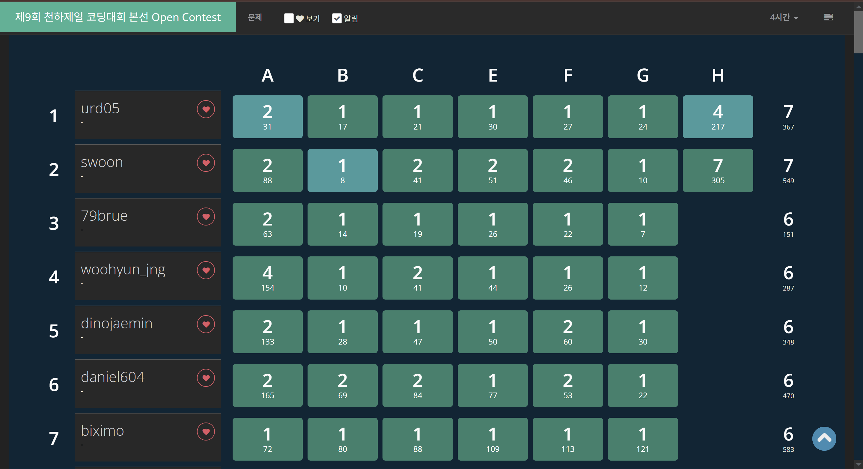 5시간 동안 9솔을 했고요 2인 2컴으로 참가해 다른 팀과 직접 비교는 어렵지만 괜찮게 했습니다.