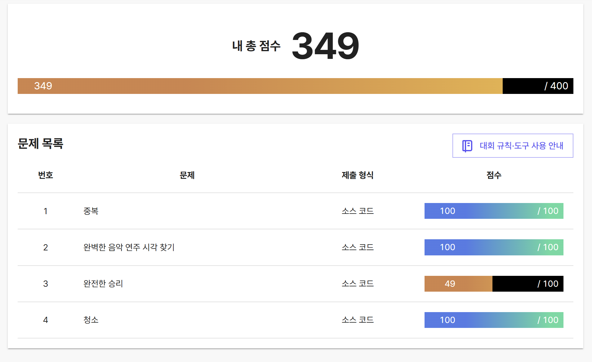1시간 만에 1, 2, 4번을 풀고 3번 풀테를 노리다가 그냥 2시간 22분에 349 받고 끝났습니다. 시간이 좀 남긴 했었는데 학교도 가야 하고 저 정도면 충분히 본선 진출권이라고 생각해 그냥 저 정도 받고 마무리했습니다.